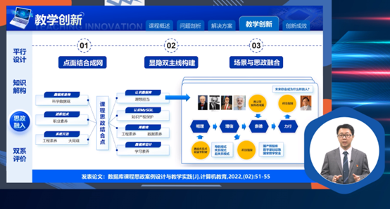 信息学院教师王若宾代表《数据库应用基础》课程组汇报的“基于‘平行+重构’的迭代迁移教学法混合式教学设计创新与实践”详细阐述了课程中的混合式教学设计创新理念与实践方法。作为应用型数据类基础课,48学时课程面向统计学、信息科学与技术、大数据等专业开设,32学时课程面向工商管理、会计学、工程管理等经济管理类专业开设。教学结合数据库课程特点和学情实际,以面向地方发展培养应用型专门人才目标为导向,提出“实践先导、思维提升、科学学习”的教学创新理念,通过夯实数据应用能力、服务专业能力发展,在通识型计算机基础课与专业课之间起到承上启下的作用。结合学校办学定位和专业能力发展需要,本课程采用迭代迁移的混合式教学,贯通课前、课中和课后,使学生逐级掌握数据库基础原理和技能,进而具备解决复杂数据存储、检索以及应用设计问题的能力,进一步适应大数据环境下应用复合型专门人才的培养需要。